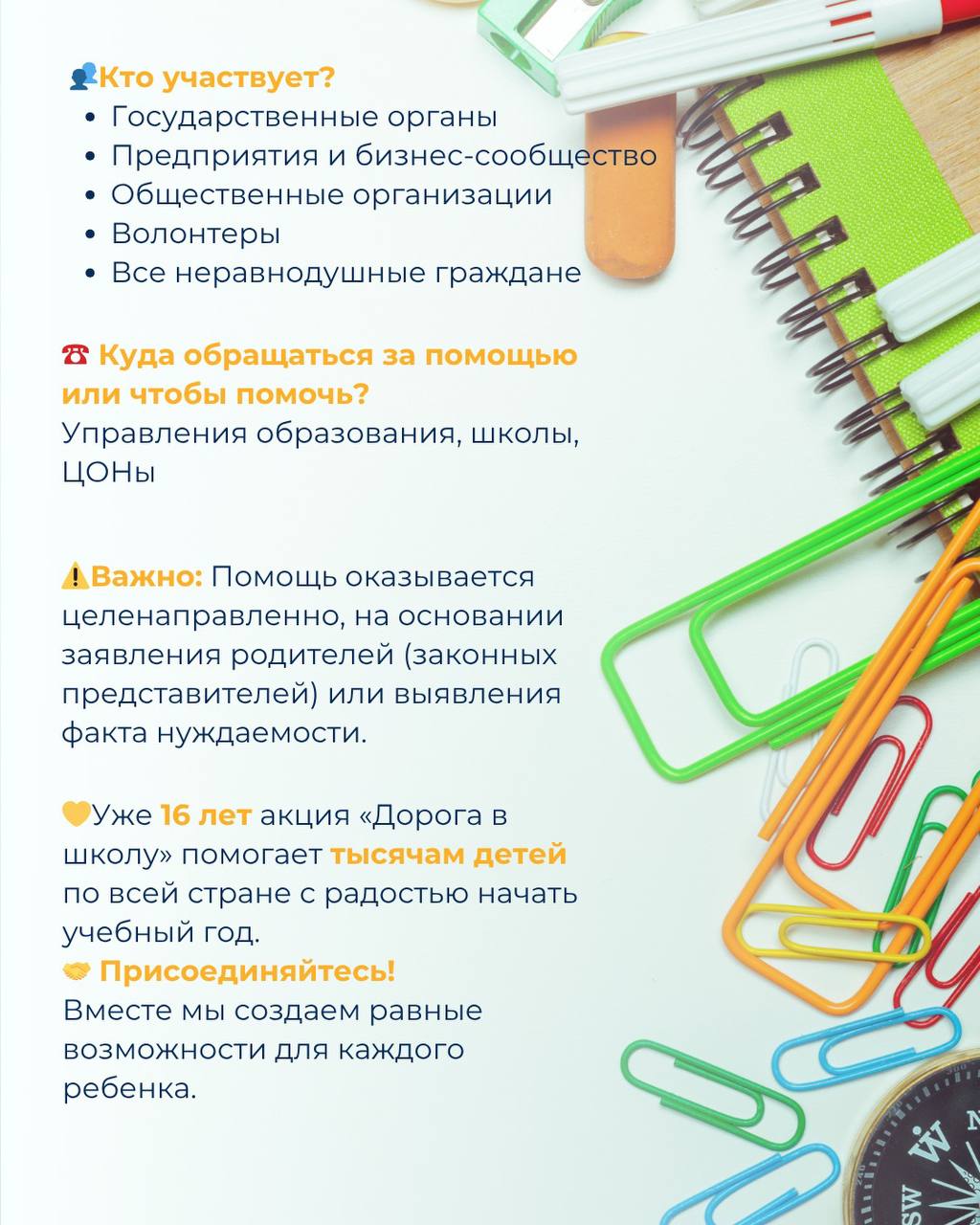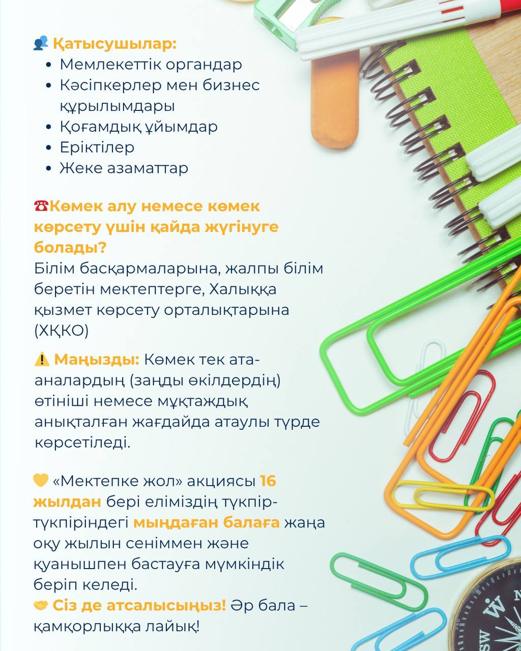 🗓️ 1 тамыздан 30 қыркүйекке дейін Қазақстанның барлық өңірлерінде жыл сайынғы республикалық «Мектепке жол» қайырымдылық акциясы өтеді.