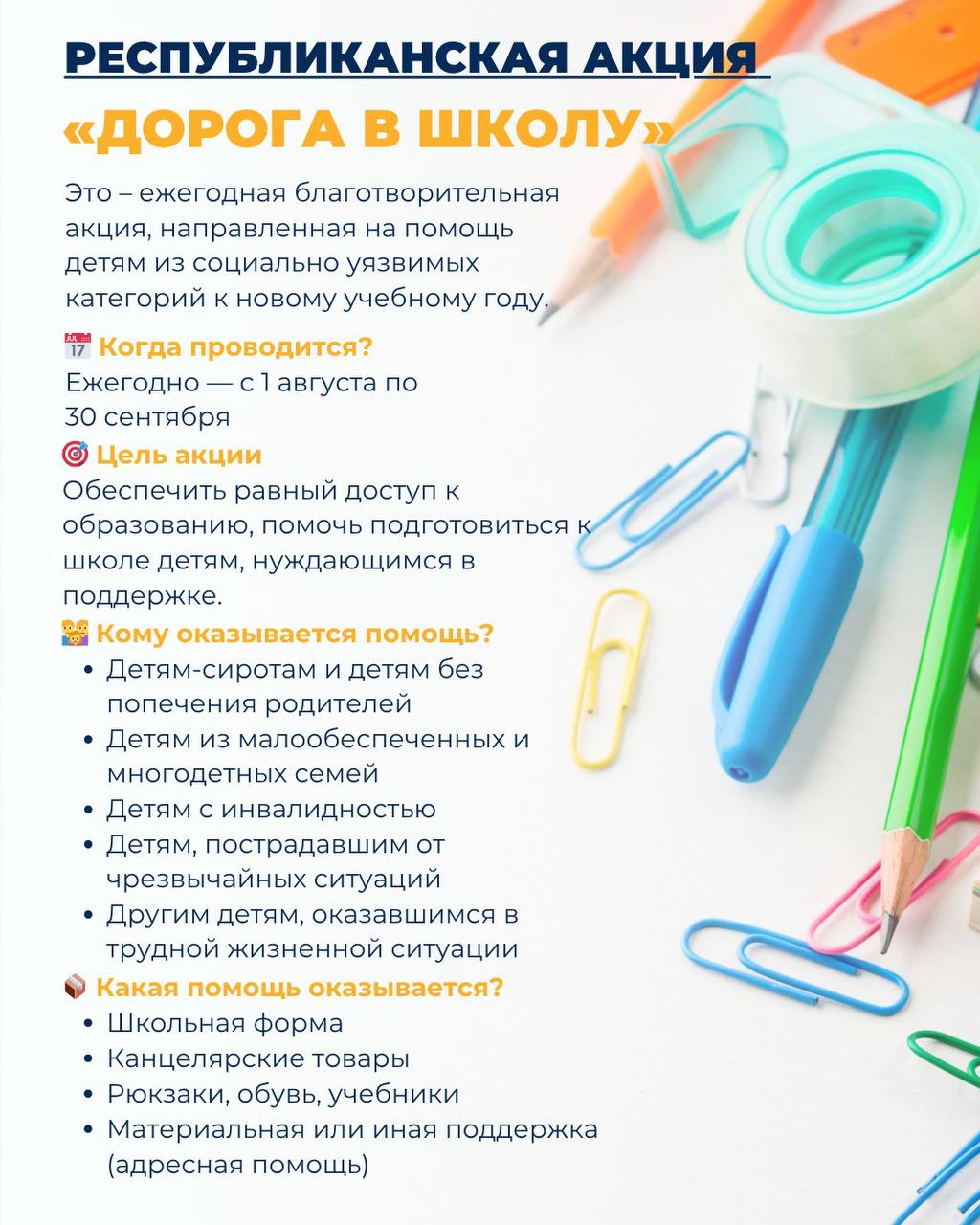 🗓️ С 1 августа по 30 сентября во всех регионах Казахстана пройдет ежегодная республиканская благотворительная акция «Дорога в школу»