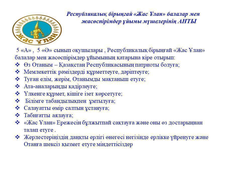 5 - сынып оқушыларына қашықтықтан "Жас Ұлан" бірыңғай балалар мен жасөспірімдер ұйымына қабылдау рәсімі