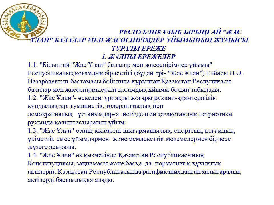 Тәуелсіздік мерекесіне орай 12 желтоқсан күні мектебіміздің аға тәлімгері Турганова Г.Е.5 - сынып оқушыларына қашықтықтан "Жас Ұлан" бірыңғай балалар мен жасөспірімдер ұйымына қабылдау рәсімін өткізді. Ұйымның мақсаты: өскелең жас ұрпақтың бойында патриоттық, білім мен өзін-өзі жетілдіруге деген құштарлық, беріктік, Отан тарихына, Тәуелсіз Қазақстанның бүгіні мен болашағына деген жауапкершілікке тәрбиелеу.
