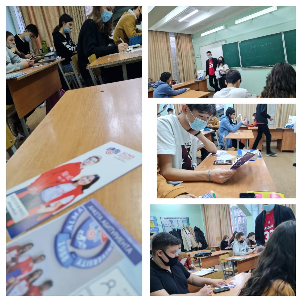 23 ноября 2021г администрация КГУ «Школа-гимназия №5» и координатор Алматы Менеджмент Университета ознакомила учащихся 11-го класса с 7 уникальными преимуществами данного университета. Так же она ознакомила присутствующих с образовательными программами и профильными предметами. Рассказала, что в Алматы Менеджмент Университете обучение проходит на трех языках и имеется дополнительная языковая подготовка. Подчеркнула что в случае отсутствия сертификата ЕНТ/ несоответствия профильных предметов возможно поступление в качестве «свободного слушателя».