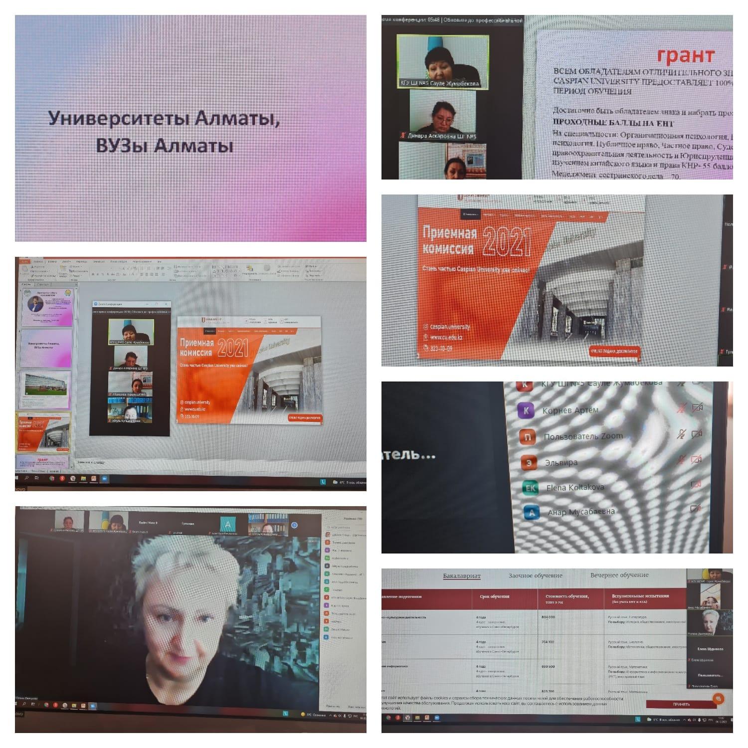 В онлайн-встрече приняли участие и.о. директора школы Жумабекова С.Н, зам. директора по УР и ВР, педагог-психолог, соц.педагог, родительская общественность 8-11 классов, а также представители ВУЗов.