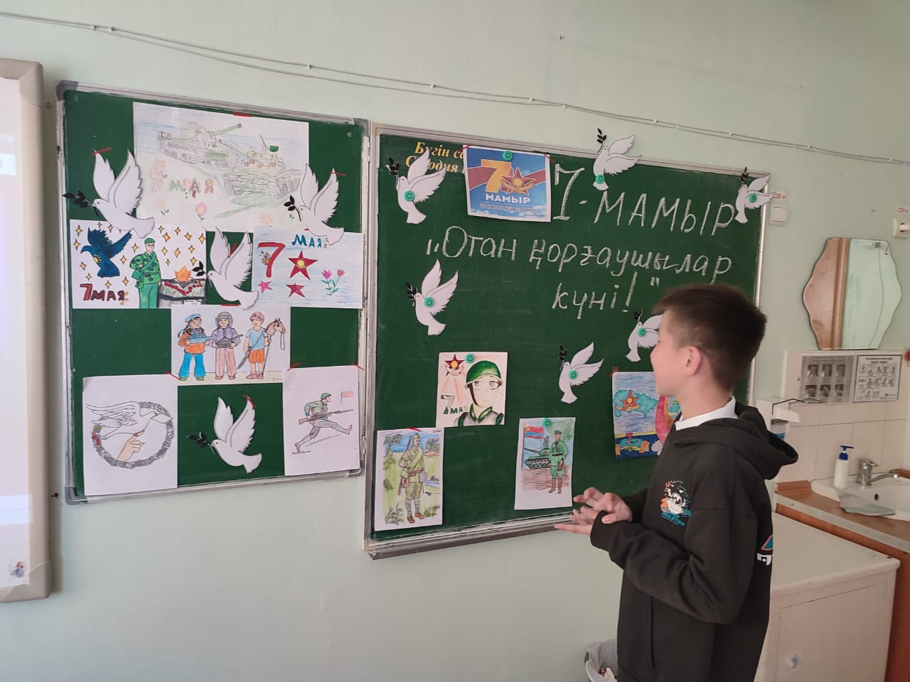 №5 мектеп – гимназия» КММ-де 02.05.2023 жылғы тәрбие жұмысының жоспарына сәйкес Отан қорғаушылар күні мен Ұлы Жеңістің 78 жылдығына арналған сынып сағаттары өткізілді. Бейнефильмдер, тақырыптық слайдтар көрсетіліп, сондай-ақ соғыс қаһармандарының ұлы ерліктері туралы әңгімелер айтылды. Кейбір оқушылар сурет салып, тақпақ айтты. Согласно плана воспитательной работы в КГУ "Школа - гимназия №5" 02.05.2023 года были проведены классные часы, посвященные дню Защитника Отечества и 78 - ой годовщине Великой Победы. Были показаны видеоролики, тематические слайды, а так же рассказы о великих подвигах героев войны. Некоторые ученики нарисовали рисунки, рассказали стихи.