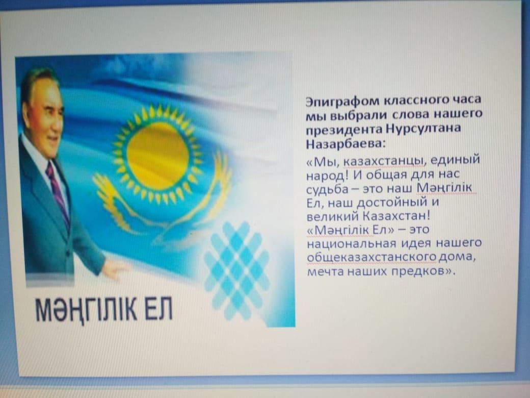 15 декабря 2020 года в КГУ «Школа-гимназия #5» согласно плана по подготовке и проведению мероприятий, посвященный Дню Независимости Республики Казахстан прошел единый классный час в 1-11 классах на тему: «Мәңгілік ел -наша сила ».