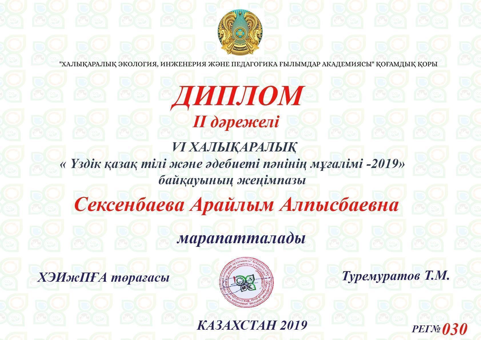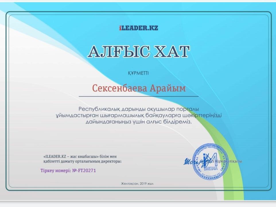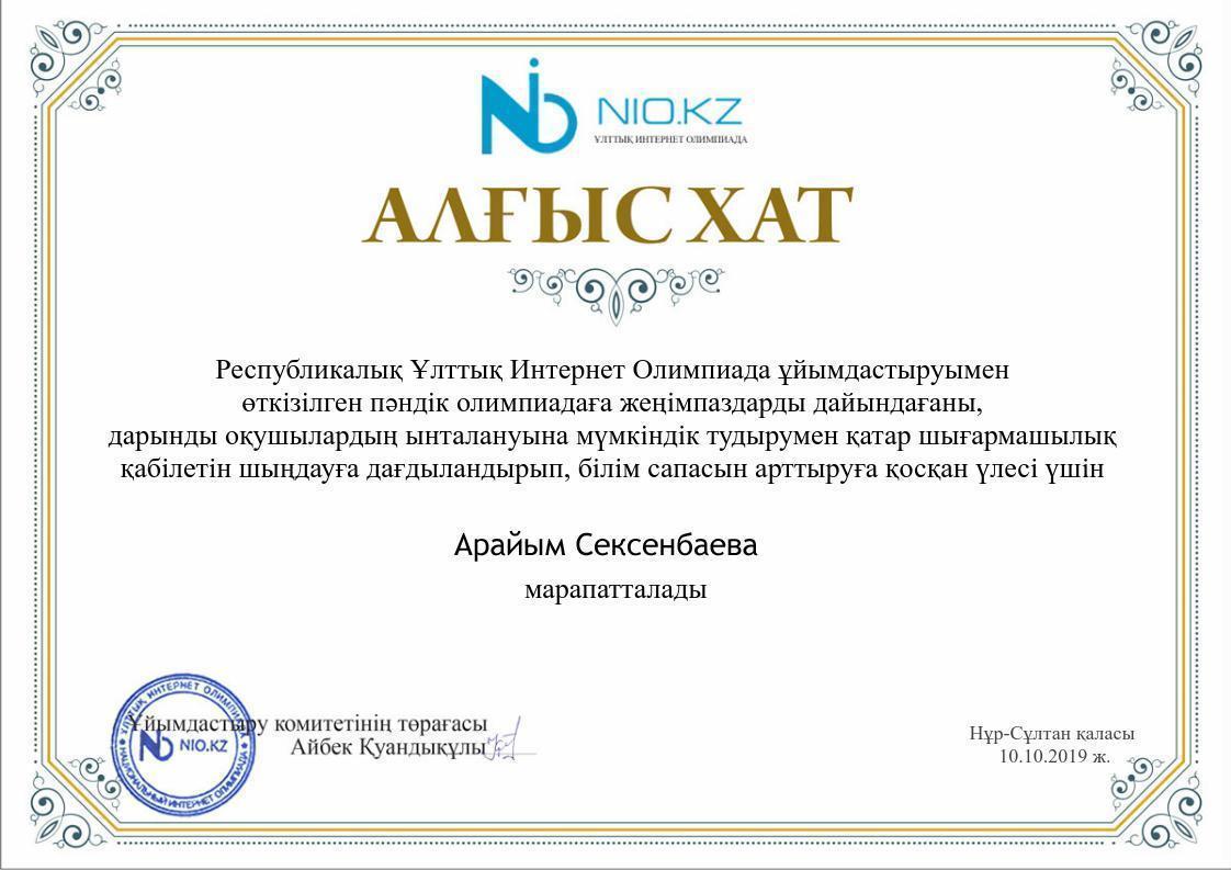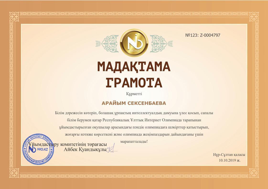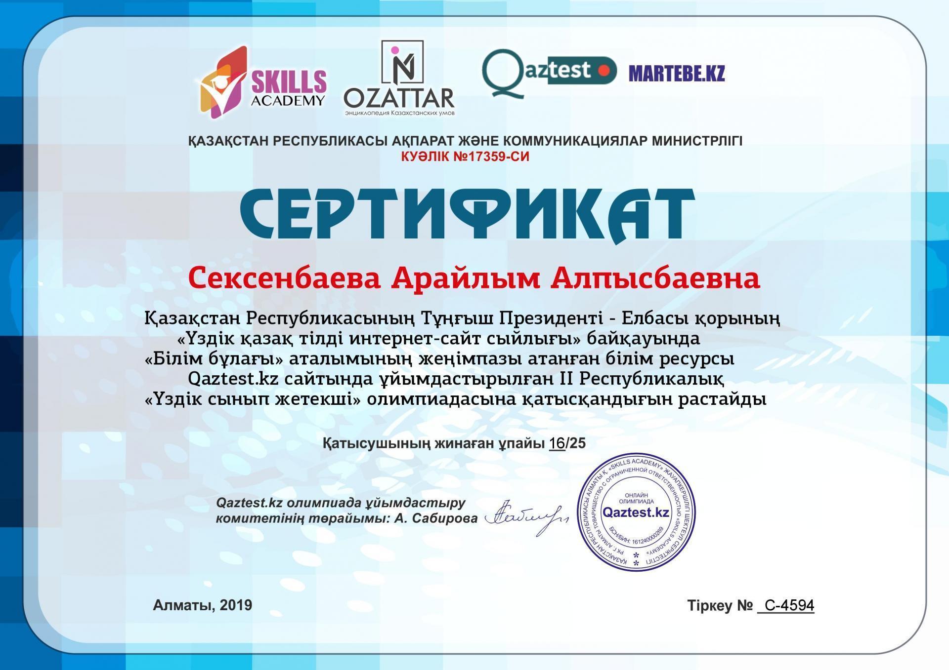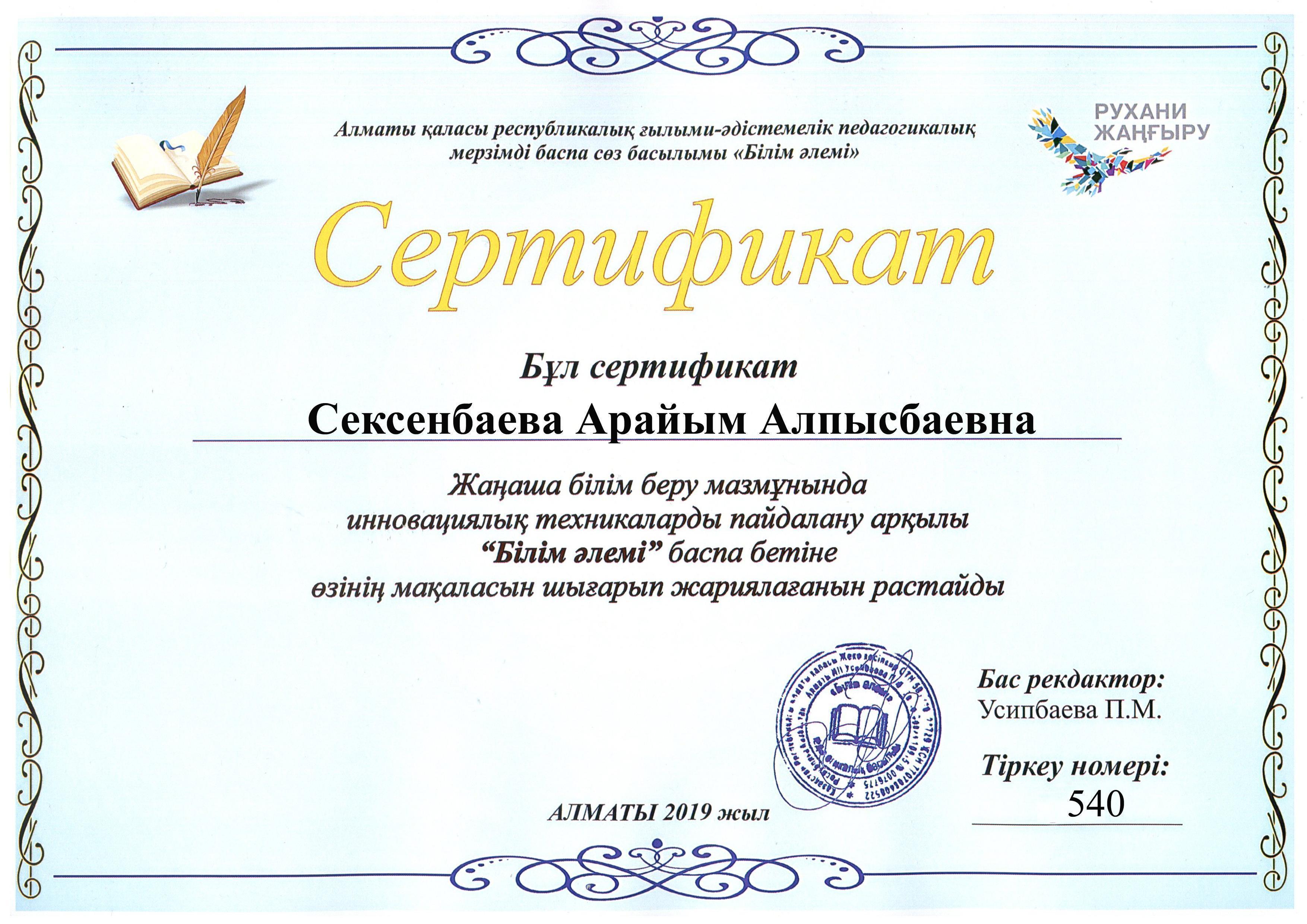 СЕРТИФИКАТ. Сексенбаева Арайлым