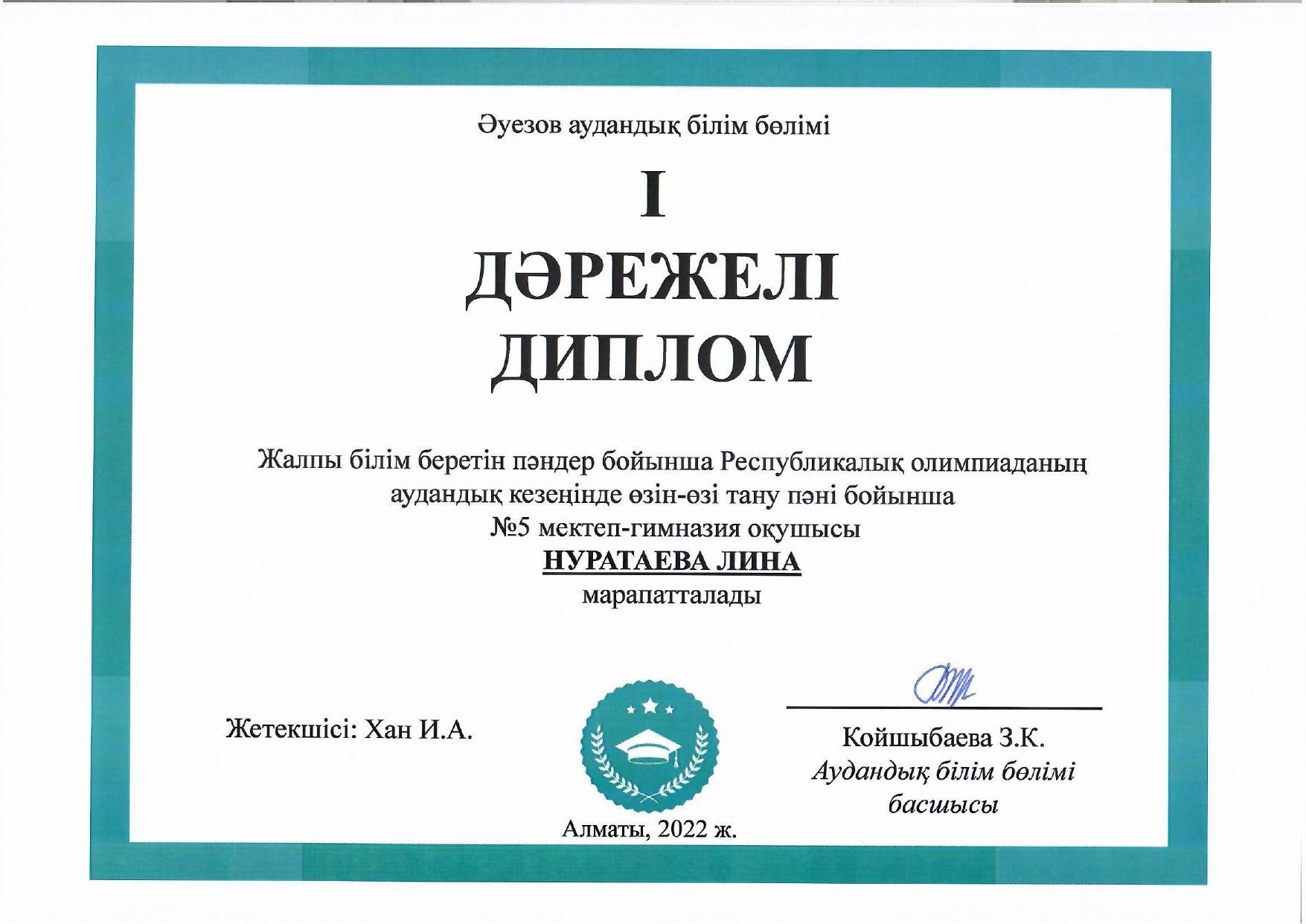 01 апрель 2022 0 1 2 3 4 5 Олимпиада По итогам городского тура олимпиады по общеобразовательным предметам учащиеся нашей школы заняли 2 первых места:Нуратаева Лина -10 кл.Сабекова Инкар -11 кл.Поздравляем победителей и руководителя Хан Ирину Афанасьевну