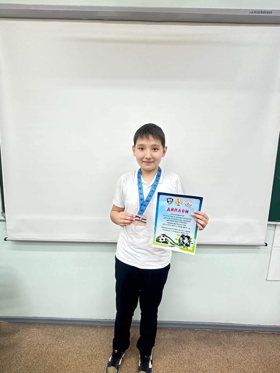 11 март 2025 0 1 2 3 4 5 Ученик 6"Б" класса Ертисов Турежан занял 3 место по футболу За участие в международном детско-юношеском турнире «футбол без границ» среди футболистов.Республика Узбекистан город Ташкент.
