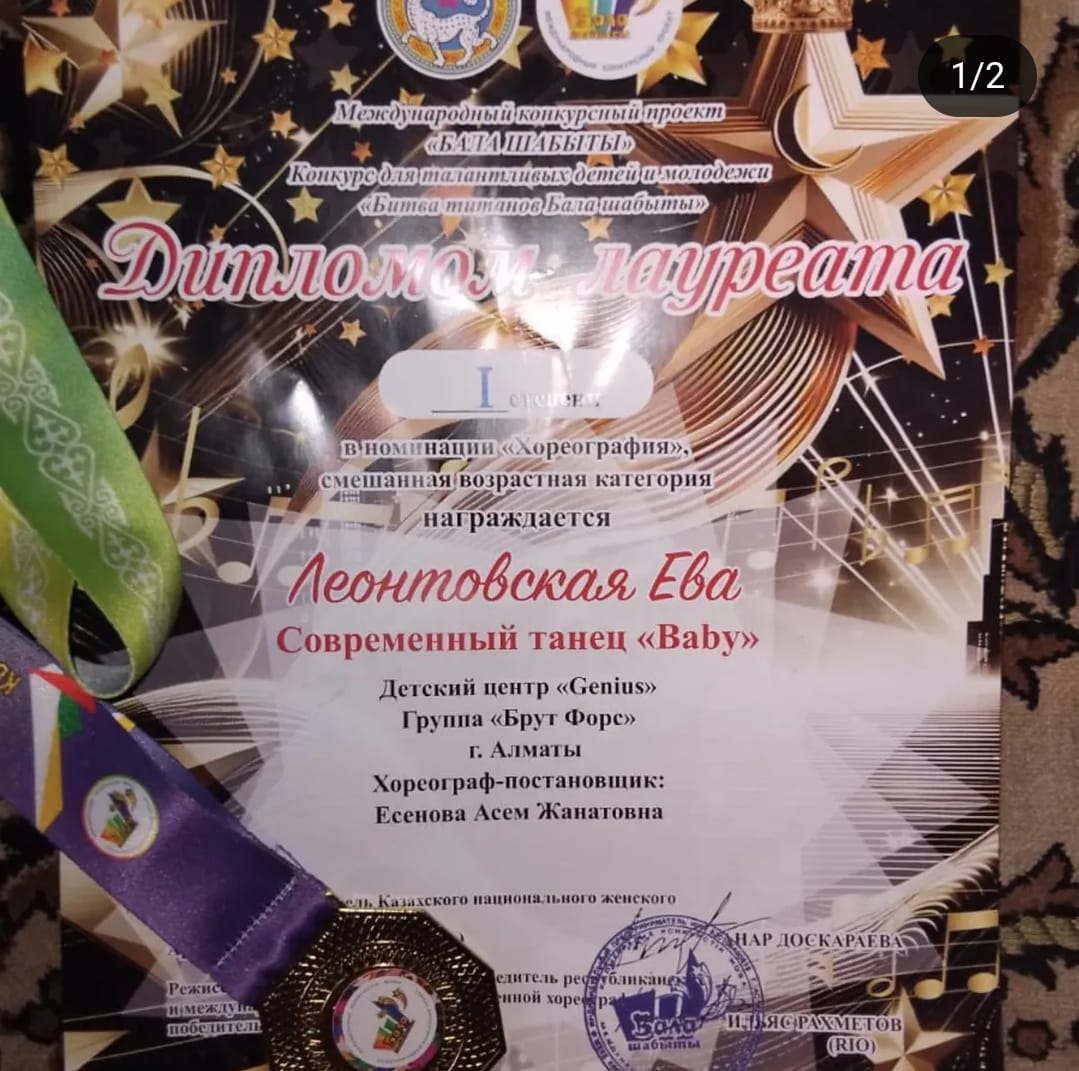 29 апрель 2025 0 1 2 3 4 5 Диплом - лауреата Леонтевская Ева, ученица 2 "Д" класса . Современный танец "Baby".