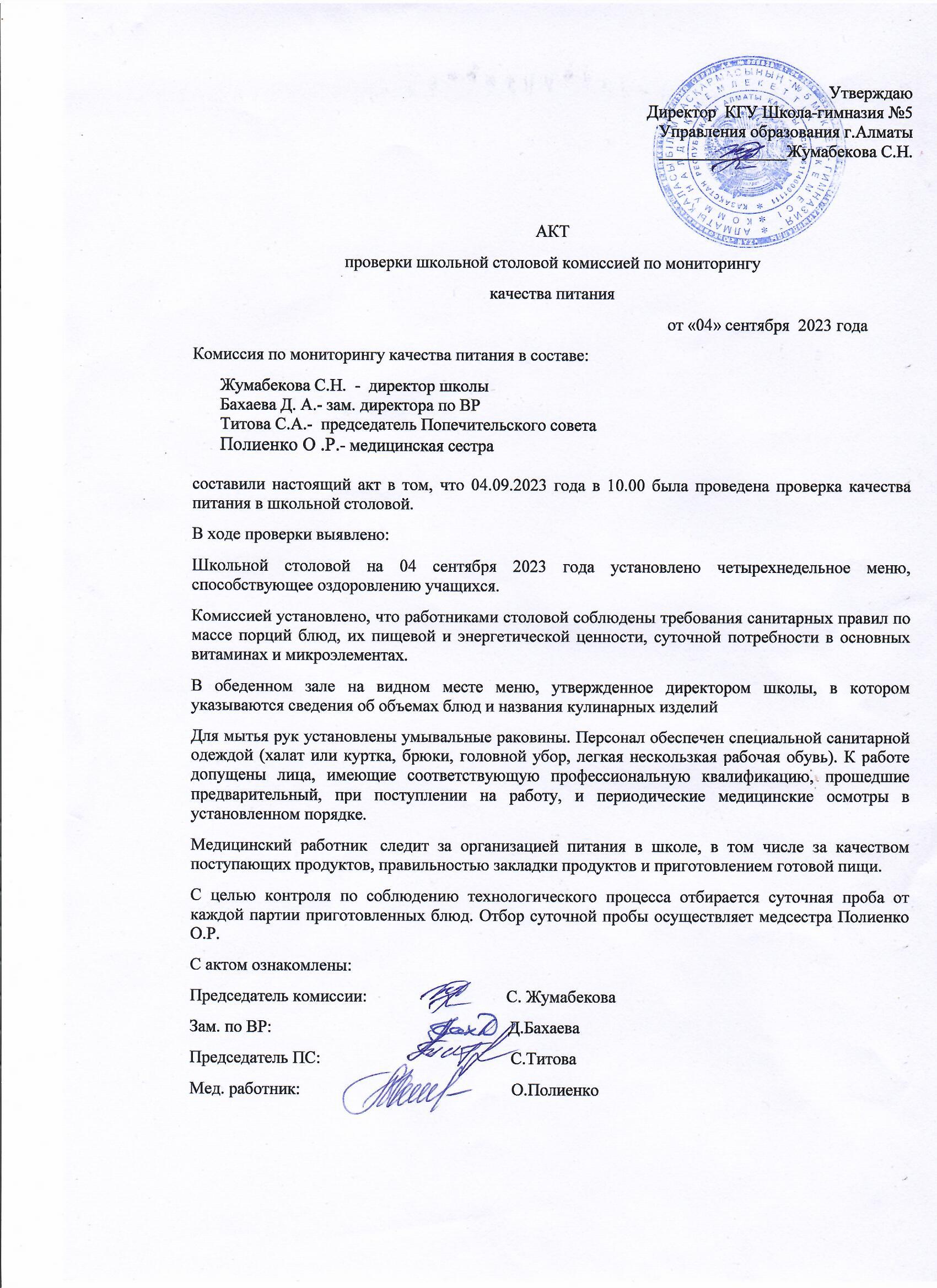 04 сентябрь 2023 0 1 2 3 4 5 АКТ мониторинг жөніндегі комиссияның мектеп асханасының тамақтану сапасын тексеру. АКТ проверки школьной комиссией по мониторингу качества питания.