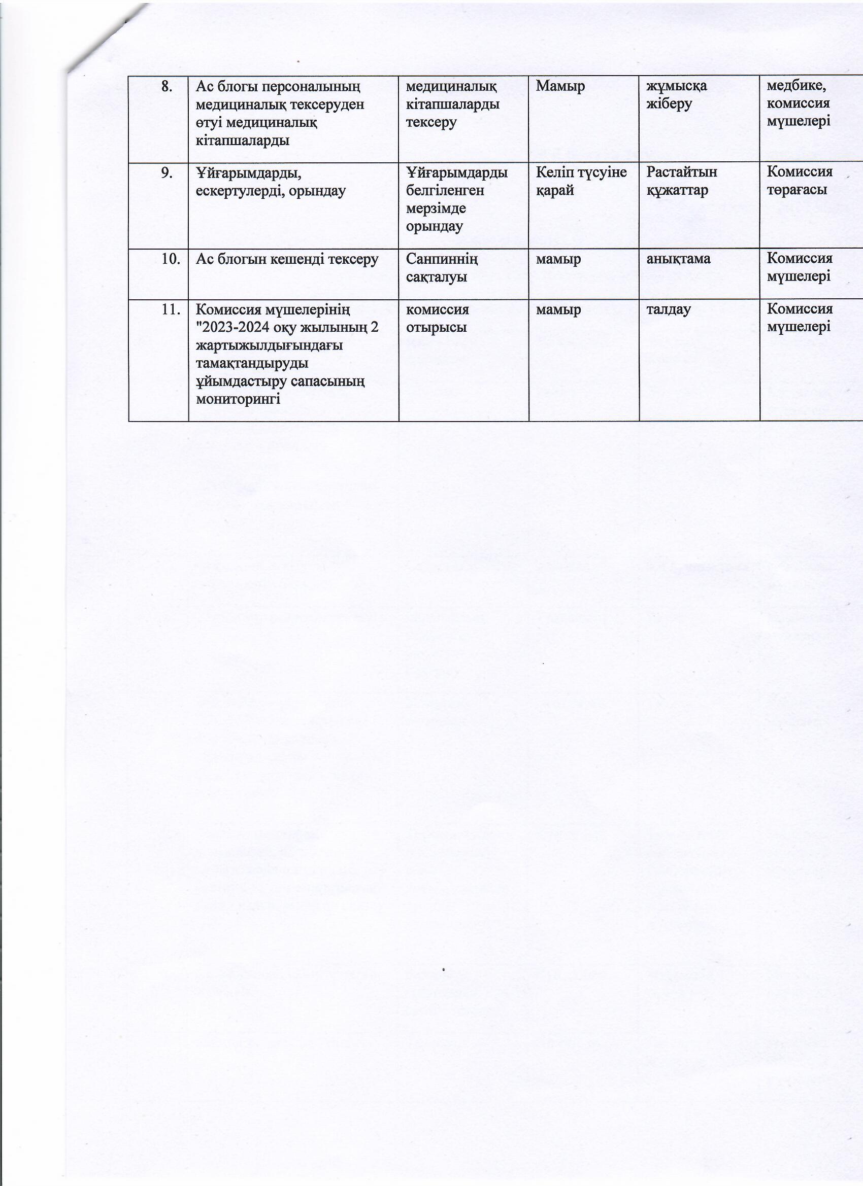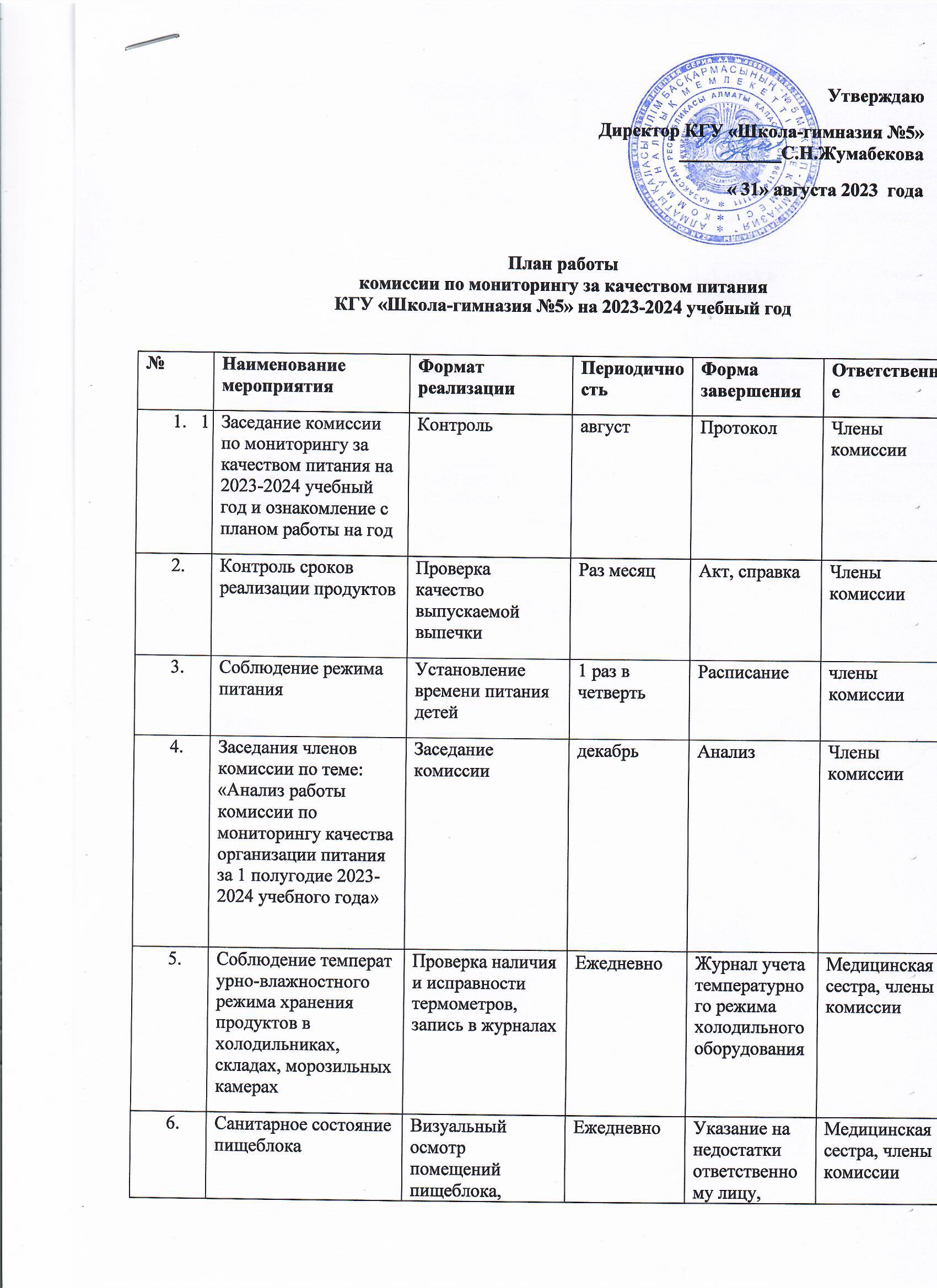 КГУ «Школа-гимназия №5»УO г.Алматы » Питание » План работы комиссии по мониторингу за качеством питания на 2023-2024 год. 2023-2024 оқу жылына арналған тамақтану сапасын бақылау жөніндегі комиссиялар жұмыс жоспары.