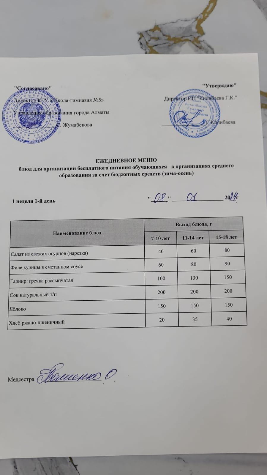 Меню блюд на 08 января 2024 года