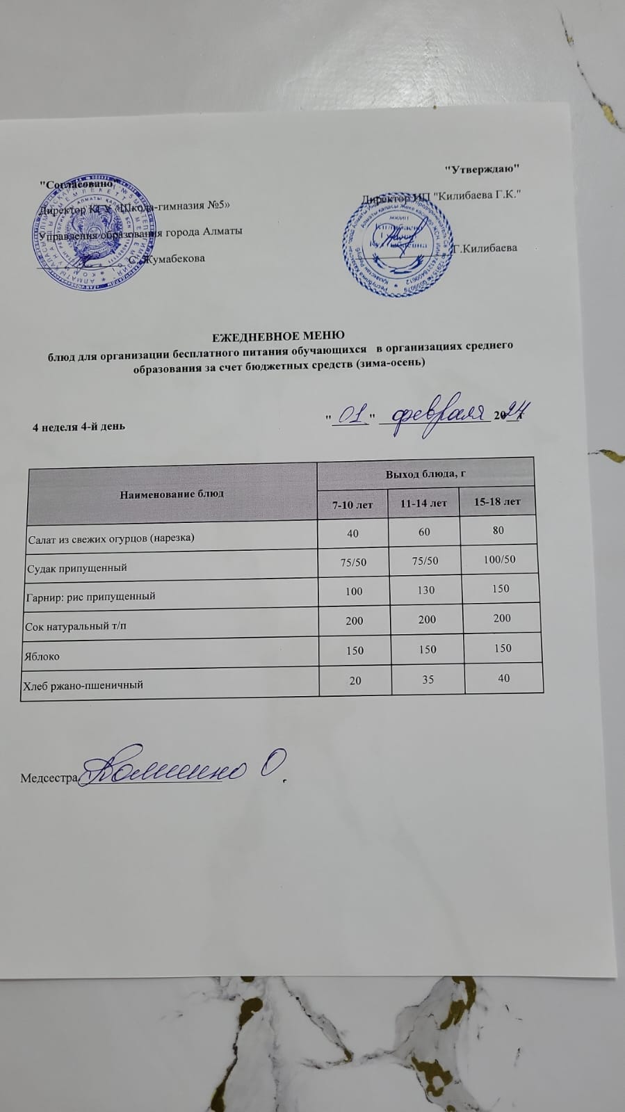 Меню блюд на 01 февраля 2024 года