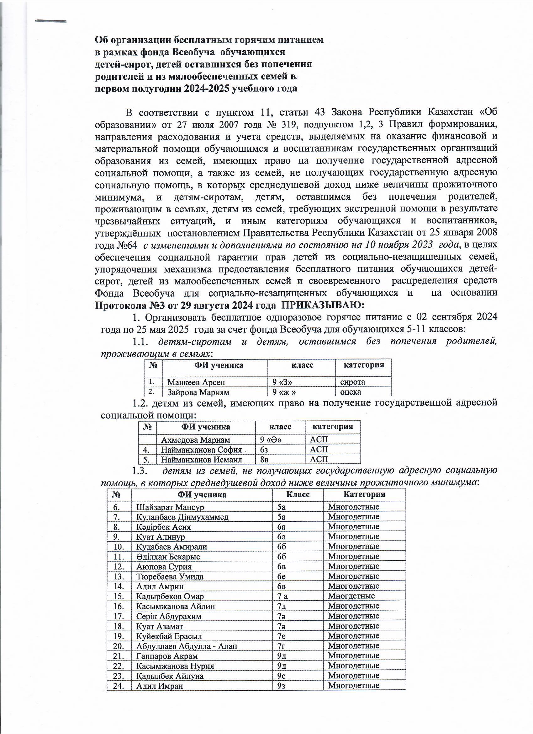 2024-2025 оқу жылының бірінші жартысында жетім балалар мен ата-анасының қамқорлығынсыз қалған балаларға ыстық тамақпен қамтамасыз ету. Об организации бесплатным горячим питанием для детей-сирот, оставшихся без попечения родителей в первом полугодии.