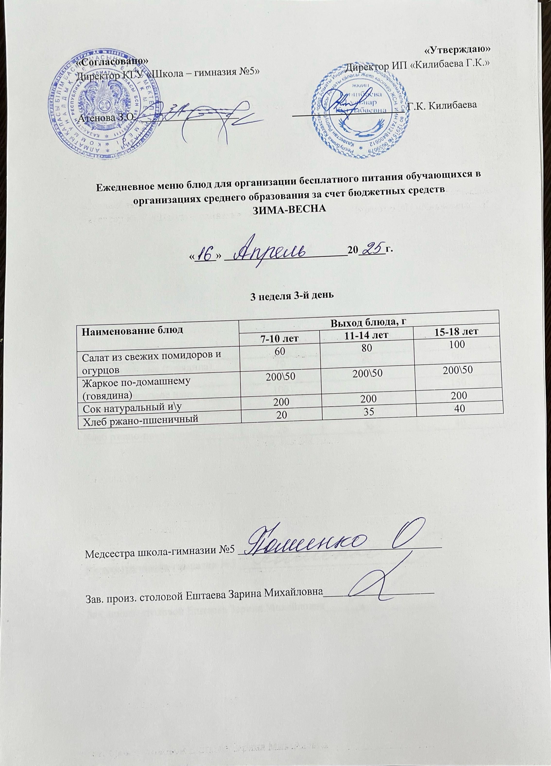 Меню блюд на 16 апреля 2025 года