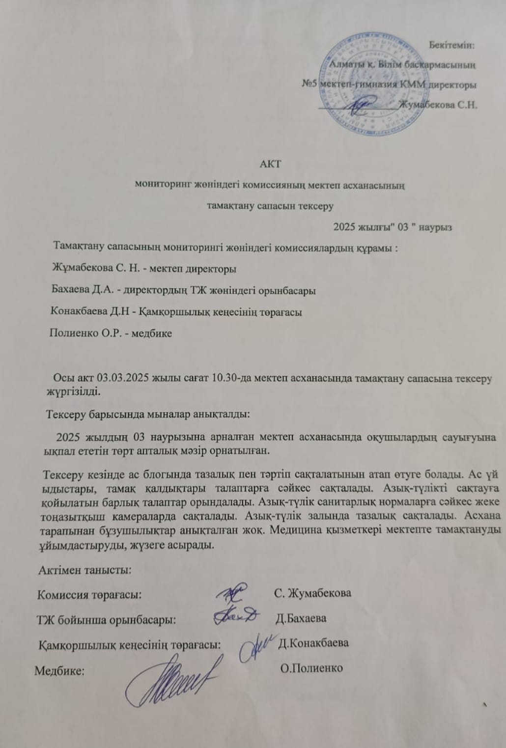 КГУ «Школа-гимназия №5»УO г.Алматы » Питание » АКТ мониторинг жөніндегі комиссияның мектеп асханасының тамақтану сапасын көтеру. АКТ проверки школьной столовой комиссией по мониторингу качества питания.