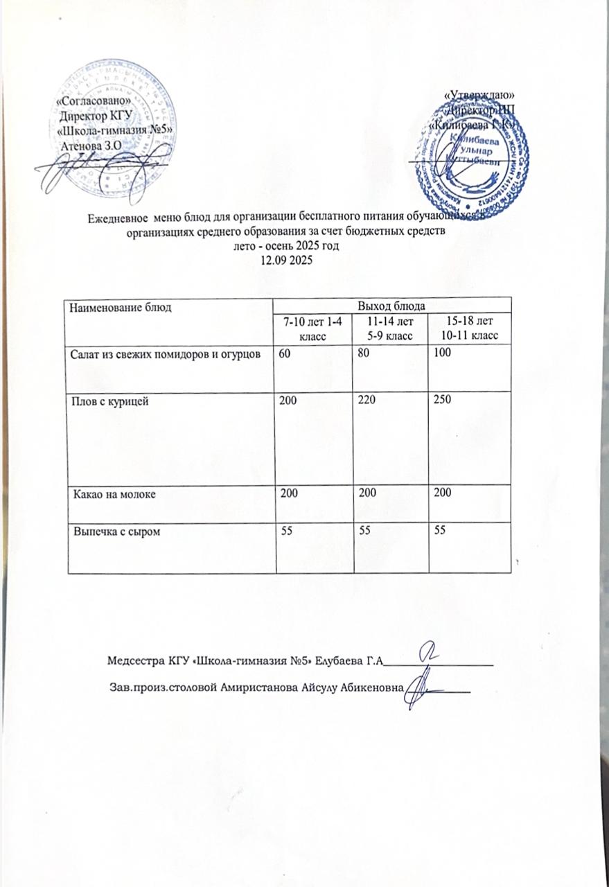 Меню блюд на 05 сентября 2025 года