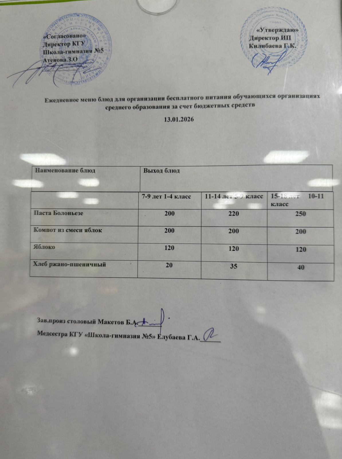 Меню блюд на 09 января 2025 года