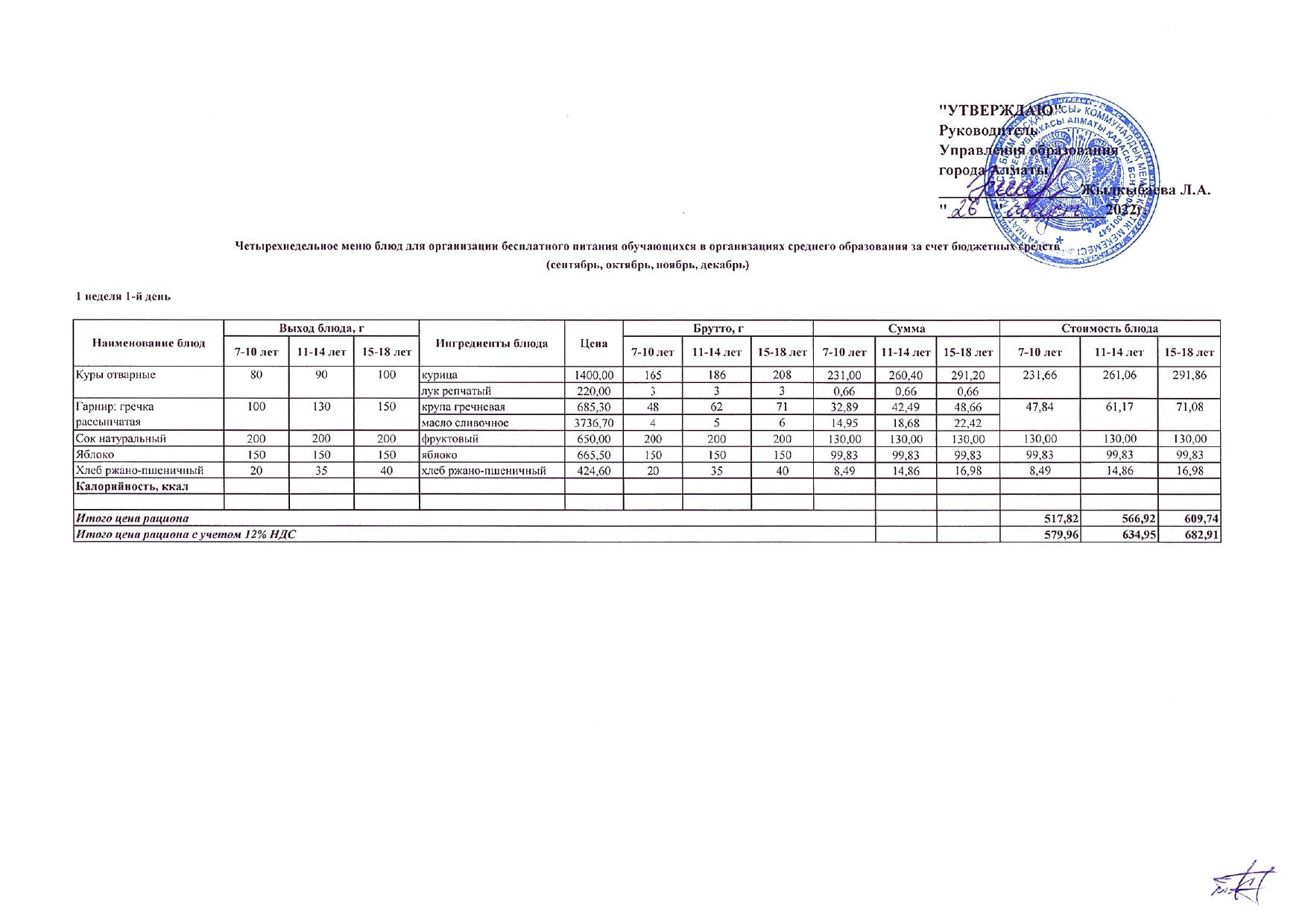 01 сентябрь 2022 0 1 2 3 4 5 Четырехнедельное меню блюд для организации бесплатного питания обучающихся в организации среднего образования за счет бюджетных средств