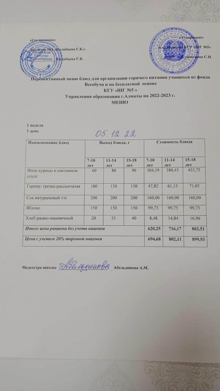 МЕНЮ Меню блюд на 05 декабря 2022 года