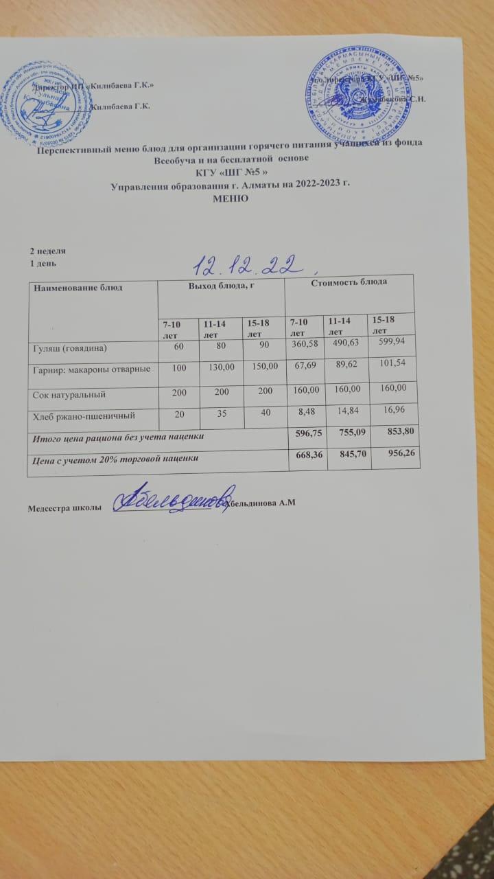 МЕНЮ Меню блюд на 12 декабря 2022 года