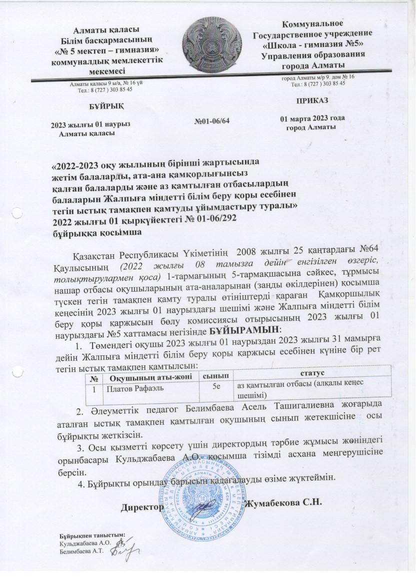 КГУ «Школа-гимназия №5»УO г.Алматы » Питание » Меню » 2022-2023 оқу жылының бірінші жартысында жетім балаларды, ата-ана қамқор-з қалған балаларды және аз қамтылған отбас-дың балаларын Жалпыға міндетті білім беру қоры есебінен тегін ыстық тамақпен қамтуды ұйым.туралы 2022 жылғы 01 қыркүйектегы №01-06/292