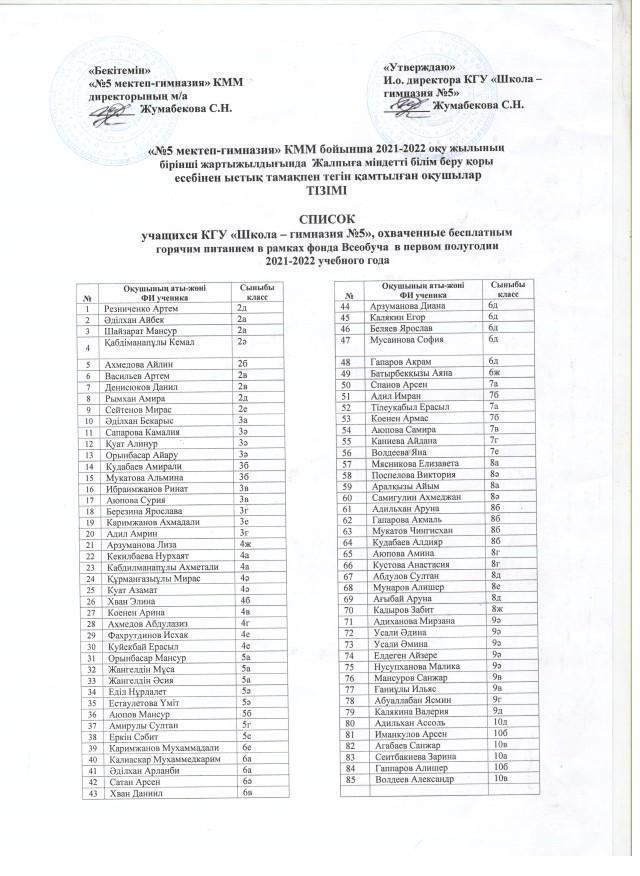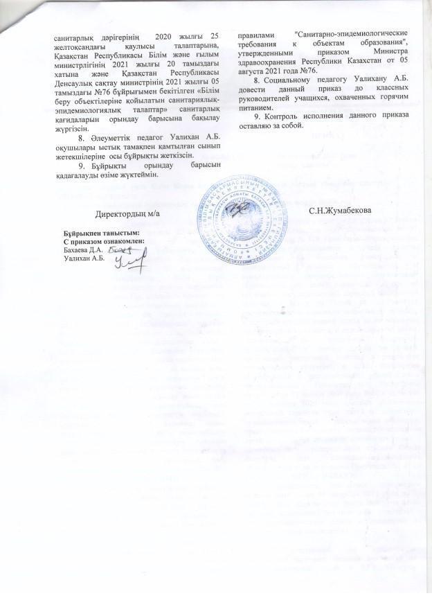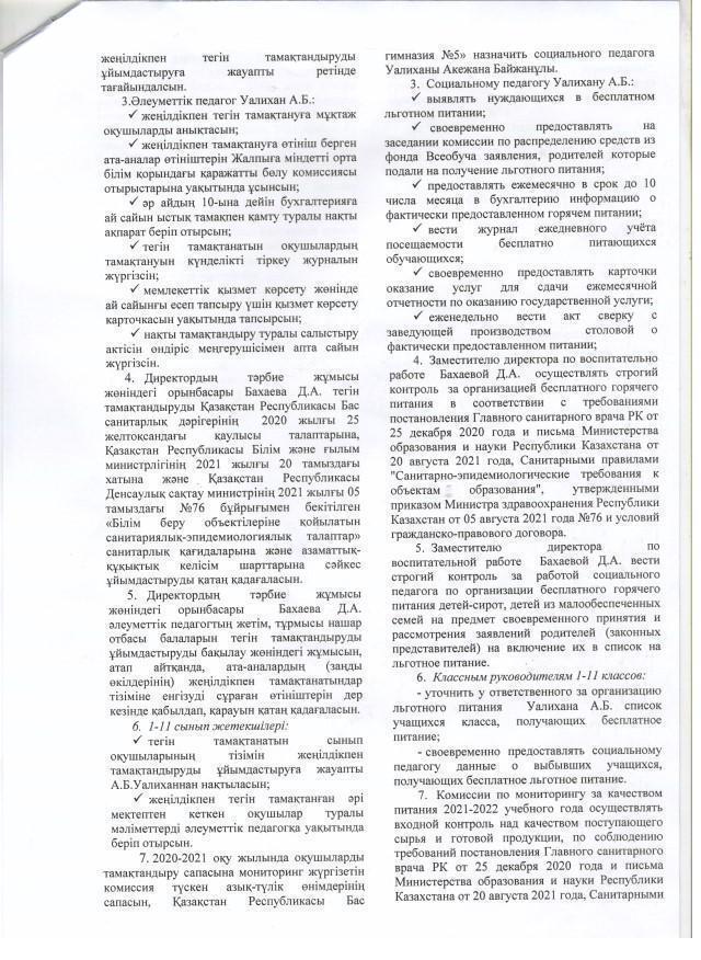 Приказ об организации питания для учащихся КГУ "Школа-гимназия №5" во втором полугодии 2021-2022 учебного года