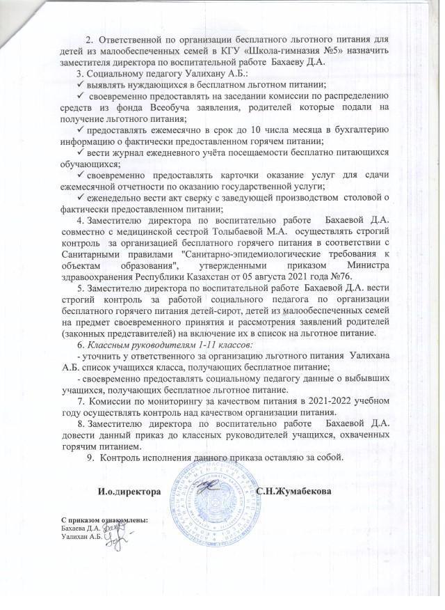 Приказ об организации питания для учащихся КГУ "Школа-гимназия №5" во втором полугодии 2021-2022 учебного года