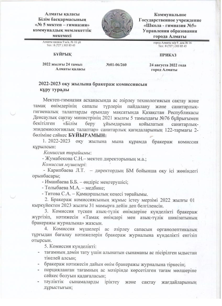 Тамақтану сапасын бақылау жөніндегі комиссиялар 2022-2023 оқу жылына арналған "№5 мектеп-гимназия" КММ