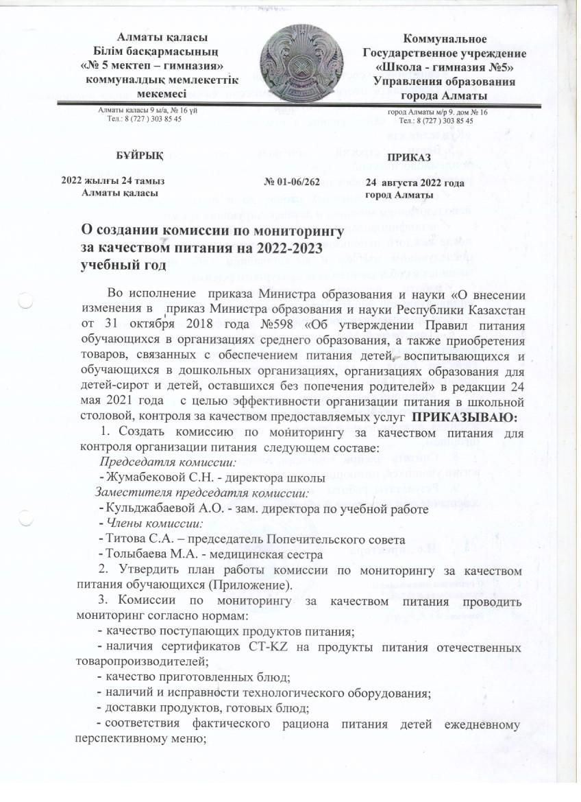 24 август 2022 0 1 2 3 4 5 О создании комиссии по мониторингу за качеством питания на 2022-2023 учебный год