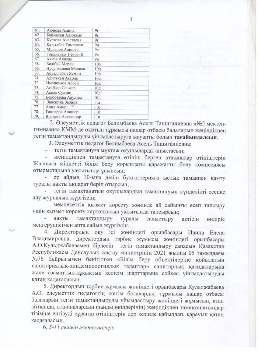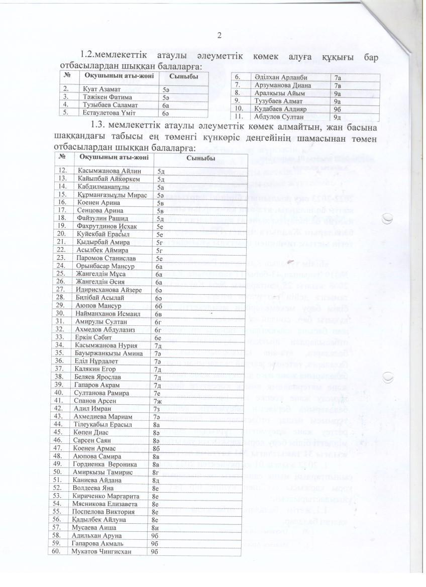 КГУ «Школа-гимназия №5»УO г.Алматы » Питание » Мониторинг качества питания » 2022-2023 оқу жылының бірінші жартысында жетім балаларды, ата-ана қамқорлығынсыз қалған балаларды және аз қамтылған отбасылардың балаларын Жалпыға міндетті білім беру қоры есебінен тегін ыстық тамақпен қамтуды ұйымдастыру туралы