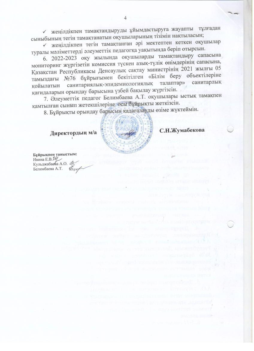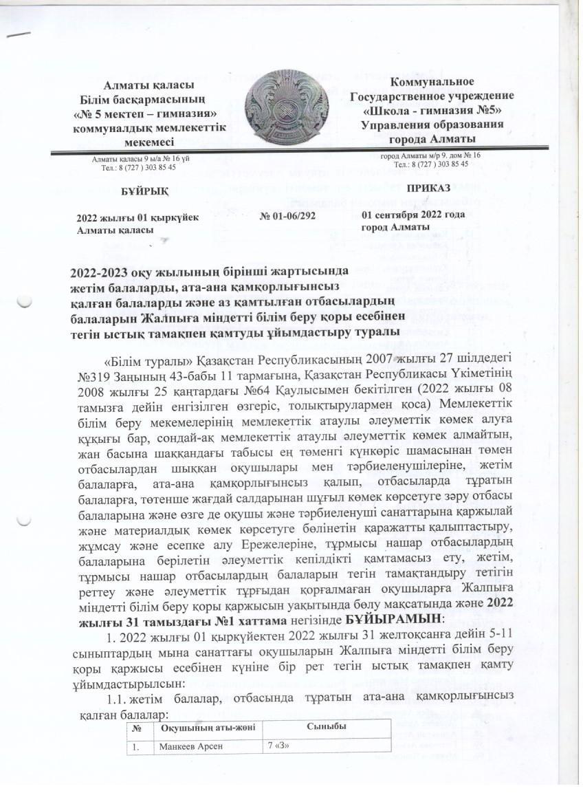 2022-2023 оқу жылының бірінші жартысында жетім балаларды, ата-ана қамқорлығынсыз қалған балаларды және аз қамтылған отбасылардың балаларын Жалпыға міндетті білім беру қоры есебінен тегін ыстық тамақпен қамтуды ұйымдастыру туралы