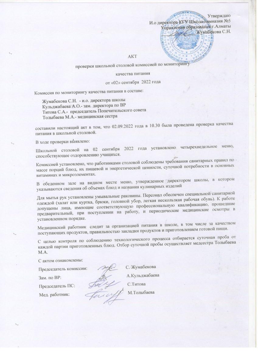 02 сентябрь 2022 0 1 2 3 4 5 АКТ проверки школьной столовой комиссией по мониторингу качества питания