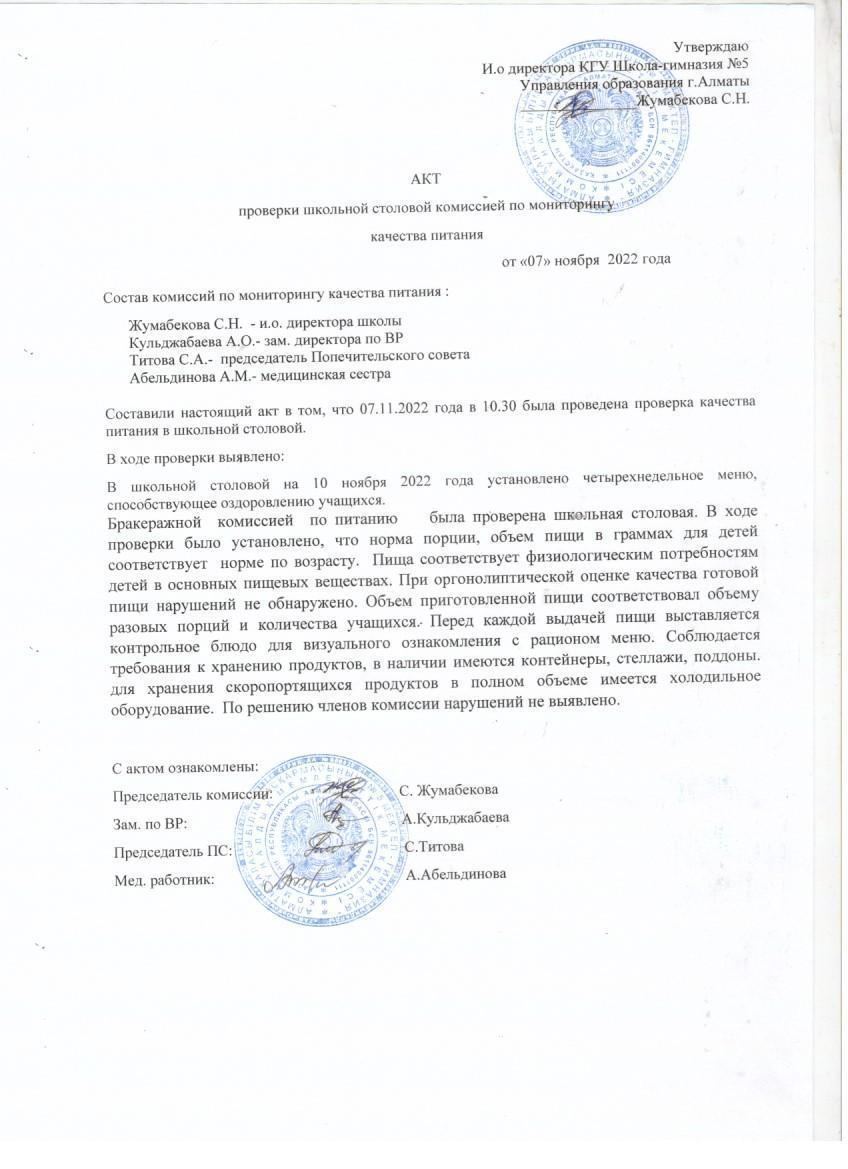 АКТ проверки школьной столовой комиссией по мониторингу качества питания