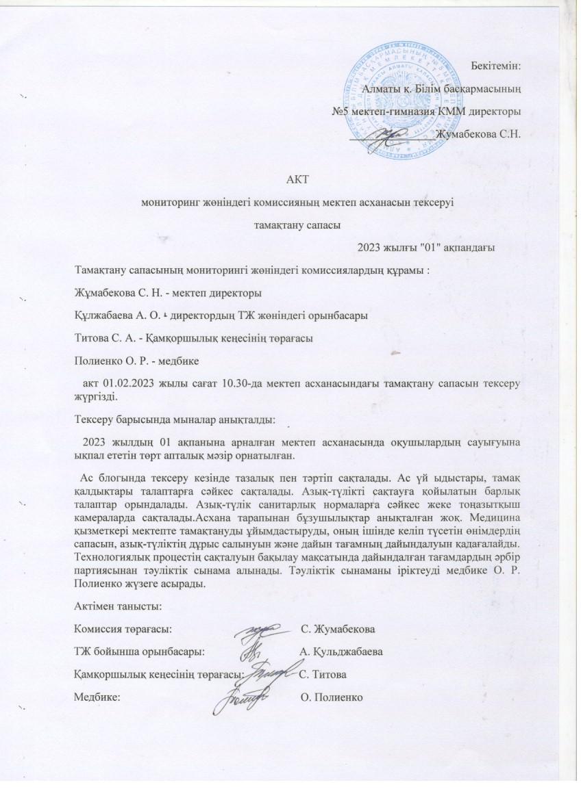 01 февраль 2023 0 1 2 3 4 5 АКТ мониторинг жөніндегі комиссияның мектеп асханасының тамақтану сапасын тексеру