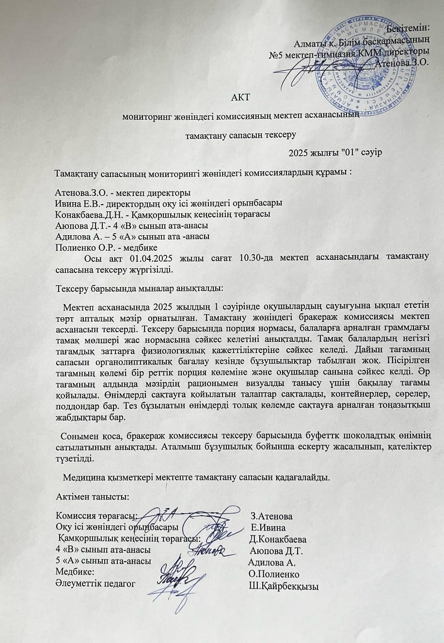 01 апрель 2025 0 1 2 3 4 5 АКТ мониторинг жөніндегі комиссияның мектеп асханасының тамақтану сапасын тексеру. АКТ проверки школьной столовой комиссией по мониторингу качества питания.