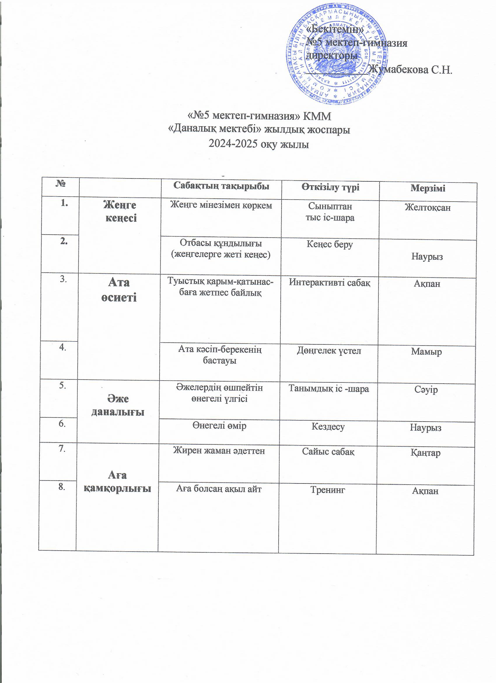 "Даналық мектебі" жылдық жоспары 2024-2025 оқу жылы