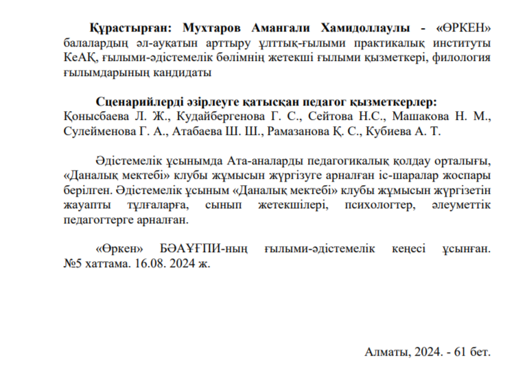 "Даналық мектебі" жылдық жоспары 2024-2025 оқу жылы