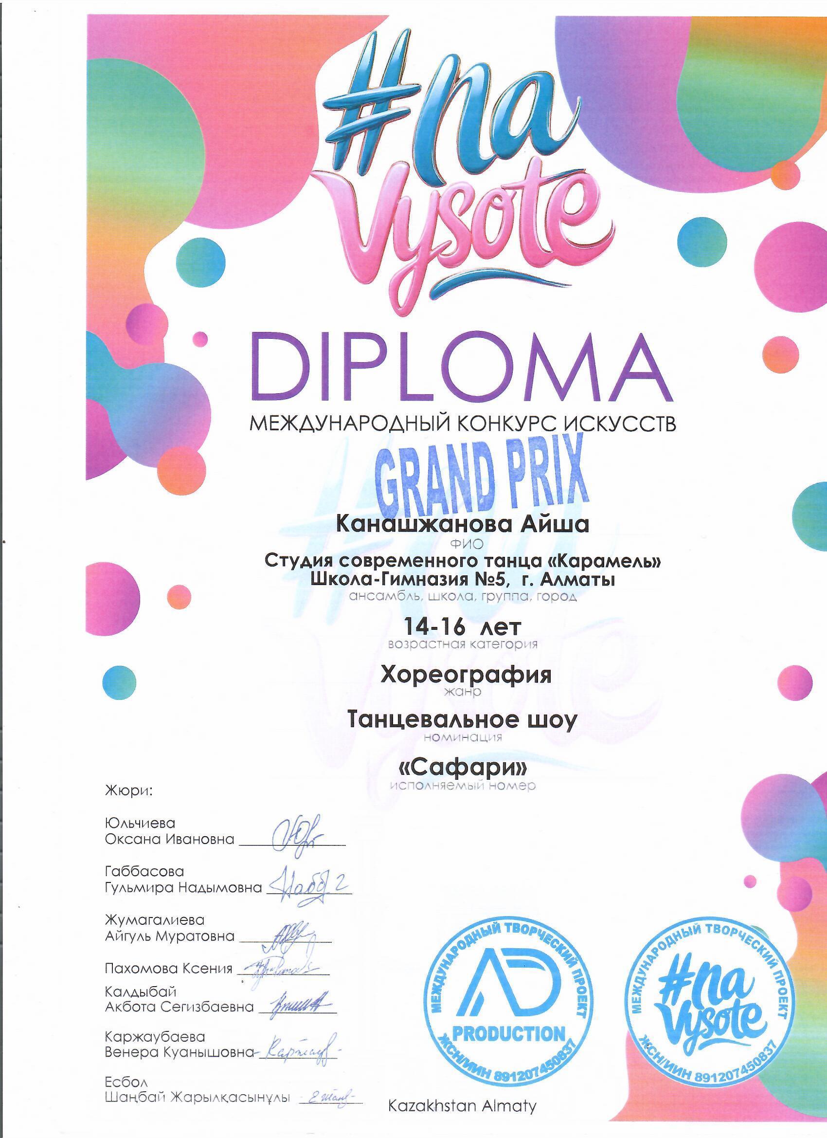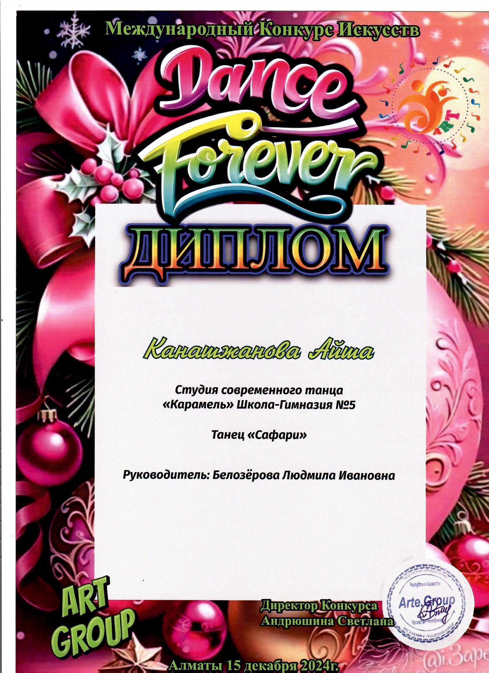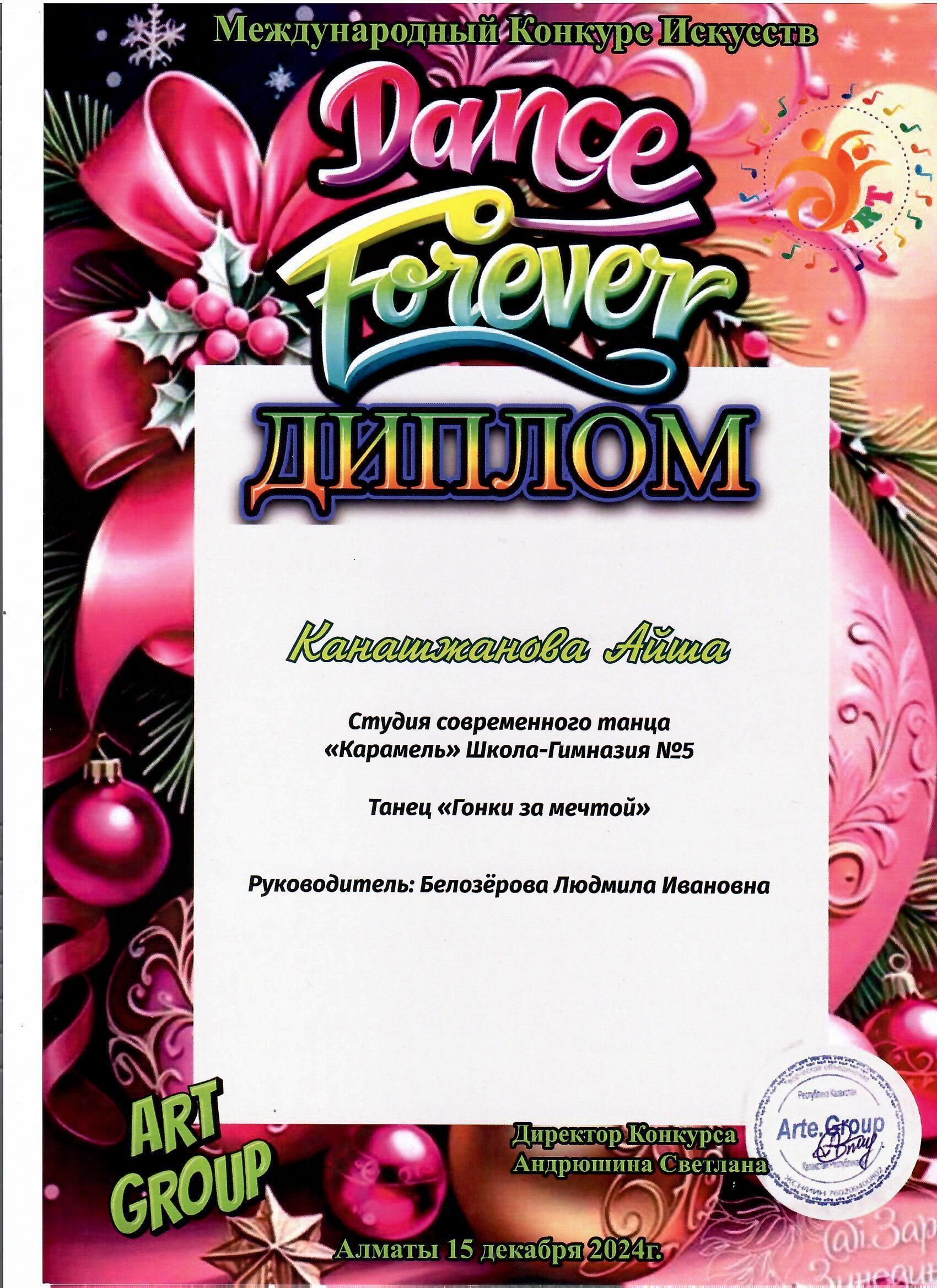 16 декабрь 2024 0 1 2 3 4 5 Достижения Канашжановой Айши, ученицы 9 "А" класса в конкурсах хореографии.